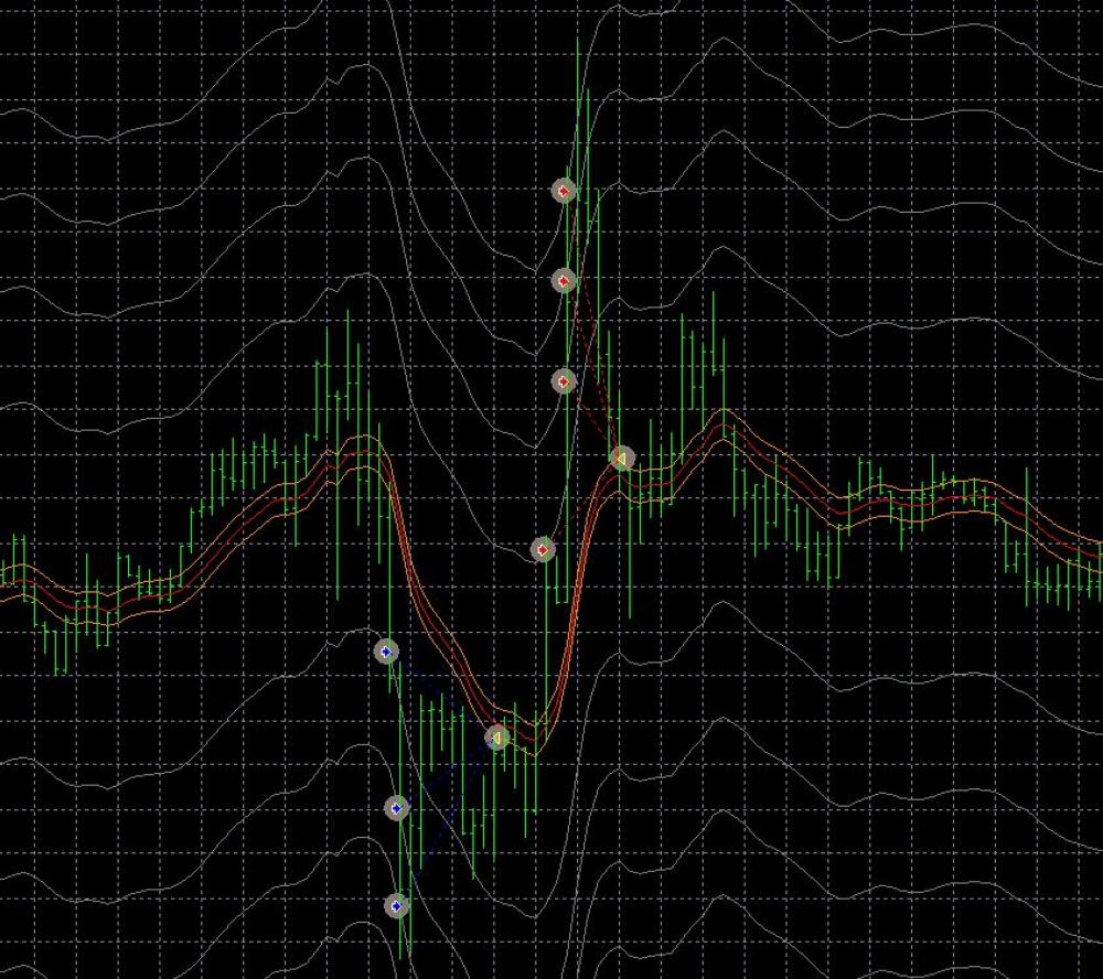 Сделки открываются по первому касанию цены с каждым уровнем индикатора (серые линии). 4 уровня-максимально 4 открытые сделки. Закрываются по сдвигу от значения МА (оранжевые линии над и под красной линией MA).