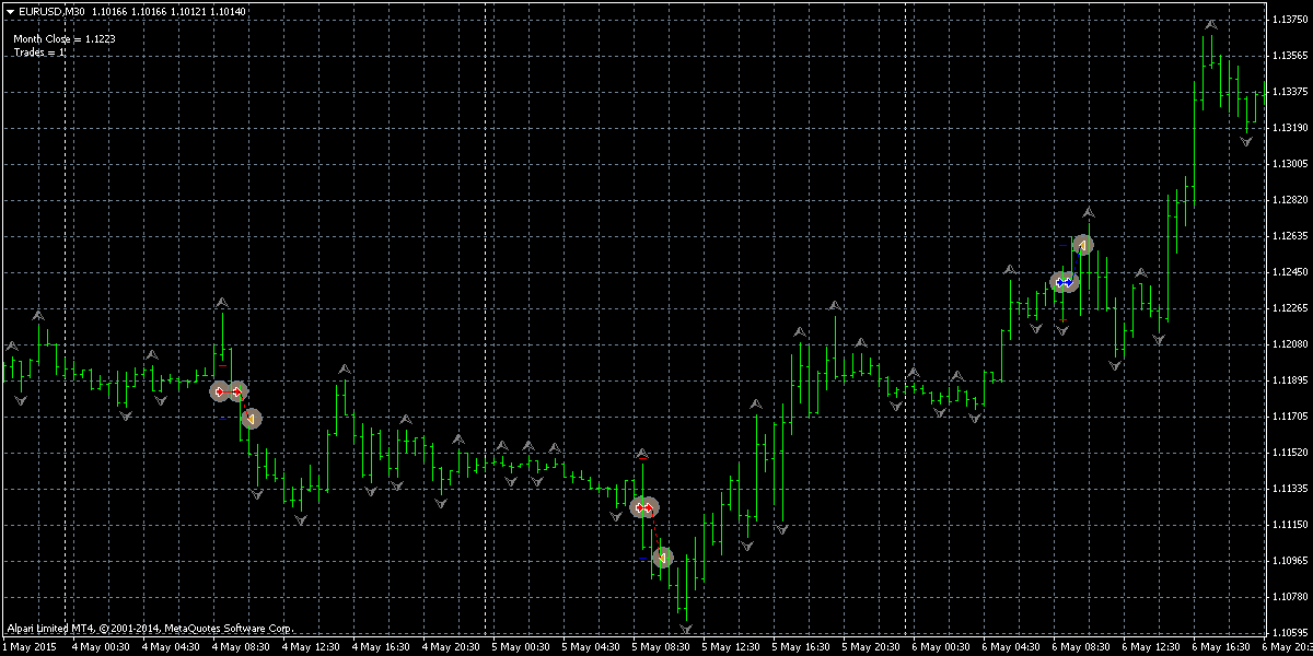 Продажа: Смотрим закрытие месяца, если цена на данный момент ниже, то выставляется ордер SELL STOP ниже 30 минутного фрактала, со стопом над верхним фракталом.